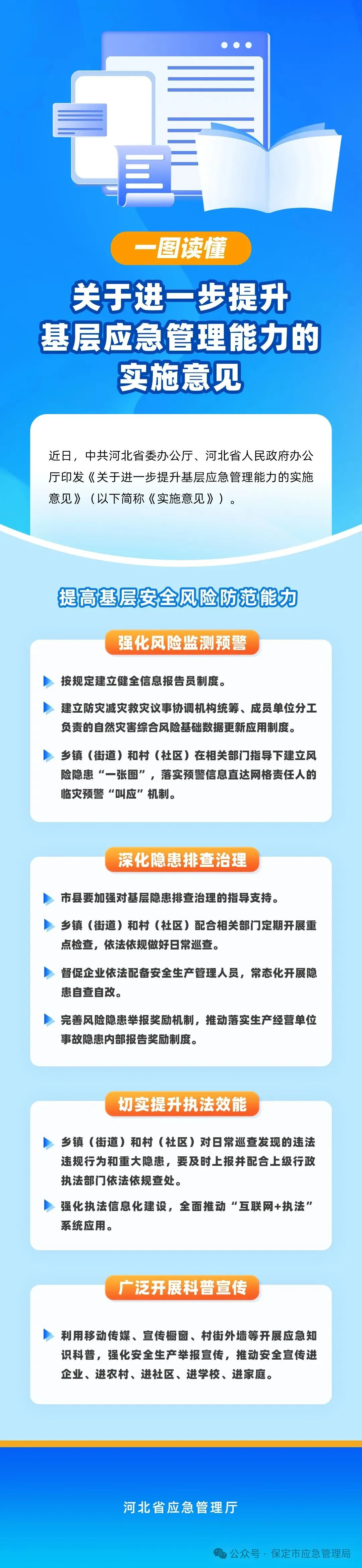 近日,中共河北省委办公厅河北省人民政府办公厅印发《关于进一步提升基层应急管理能力的实施意见》(以下简称《实施意见》)。《实施意见》提出了哪些工作任务和实施举措?一起看图来了解。